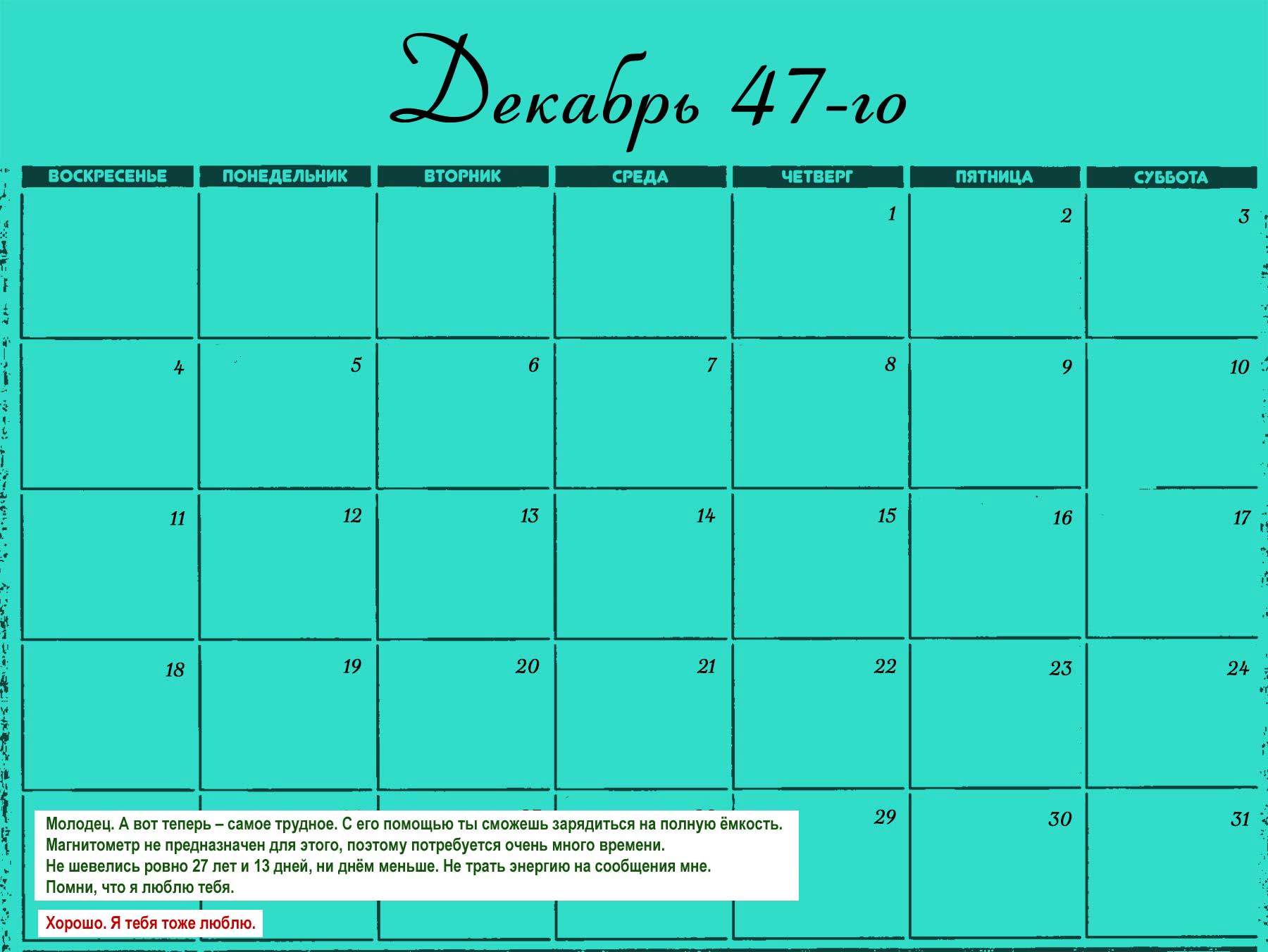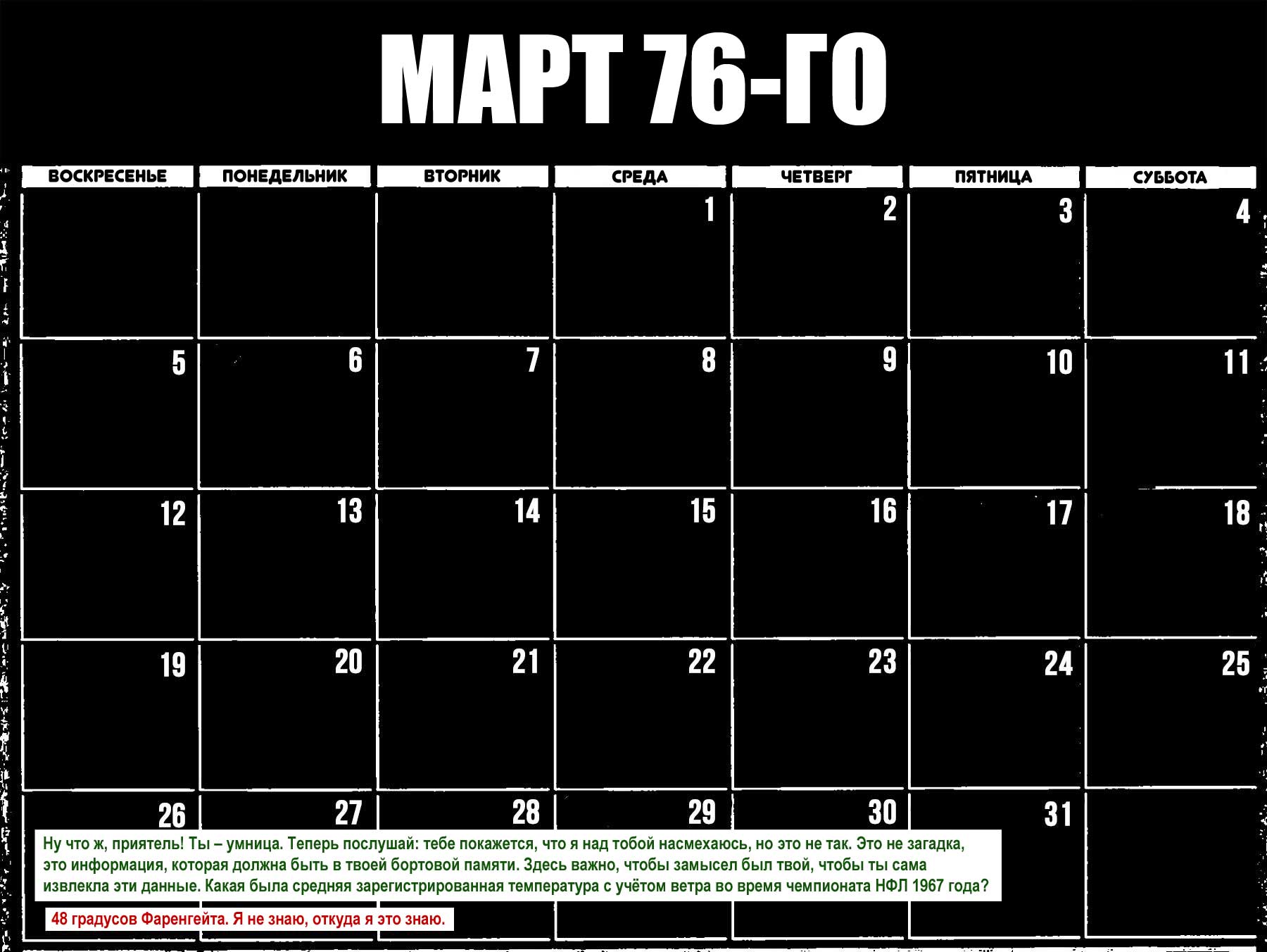 TEN: Ты отлично справилась. Потрясающая работа. Тебе было бы проще сказать «228 по Кельвину», чем «минус 48 градусов Фаренгейта», но мы хотели, чтобы ты самостоятельно докопалась до отрицательного числа… мы решили, что если ты соприкоснёшься с чем-то отрицательным, чем-то абстрактным, это достаточно сильно выбьет тебя из колеи, чтобы мы могли установить соединение.