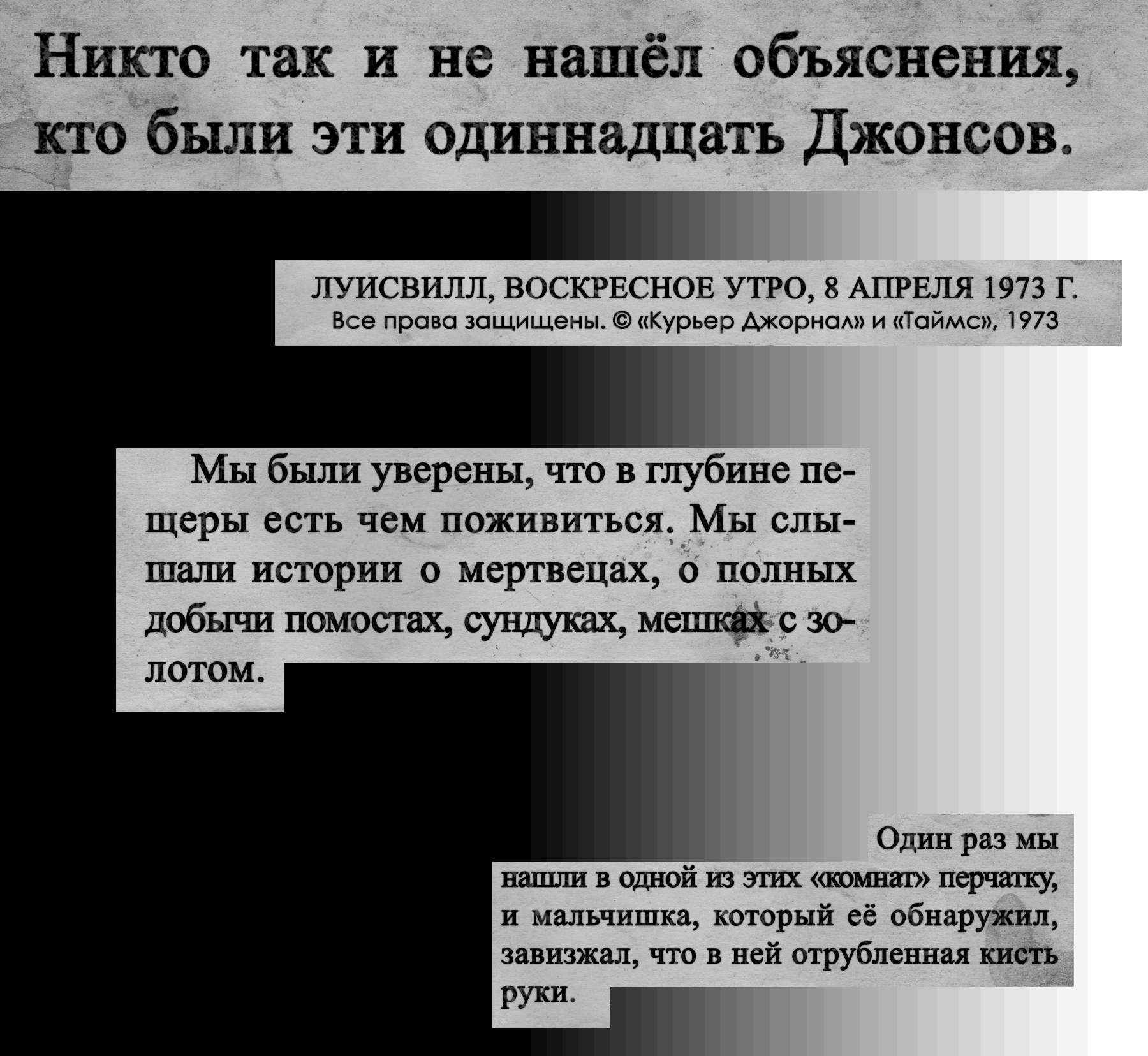 ED: Но эта пещера значит для меня ещё больше. Знаете, про неё ведь в газетах писали и всё такое. Раз в пару десятилетий кто-нибудь открывал её для себя и писал о ней. И люди такие: «Вы только подумайте! Пещера Одиннадцати Джонсов! Загадочная пещера прямо посреди большого города, а мы и не знали!» Потом они отвлекались на что-нибудь новое, а спустя ещё 20 или 30 лет кто-нибудь снова о ней вспоминал.
