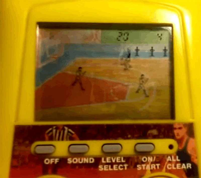 ED: Это «Дабл Дриббл». Одна из старых карманных игр от «Конами» – помните такие? Экран тут – ну, как вам сказать – я бы это даже экраном не назвал. Просто напечатанное изображение баскетбольной площадки, а на ней включаются и гаснут маленькие ЖК-иллюстрации. Мне её внук показал, давным-давно, когда её только выпустили. Я до того никогда в жизни в видеоигры не играл и считал, что слишком стар для всей этой петрушки. Но я шпилил в неё без остановки. Вот этот человечек – это ты, надо вести мяч, обходить защитников и набирать очки. Вот и вся игра. Набрал 99 очков – выиграл.