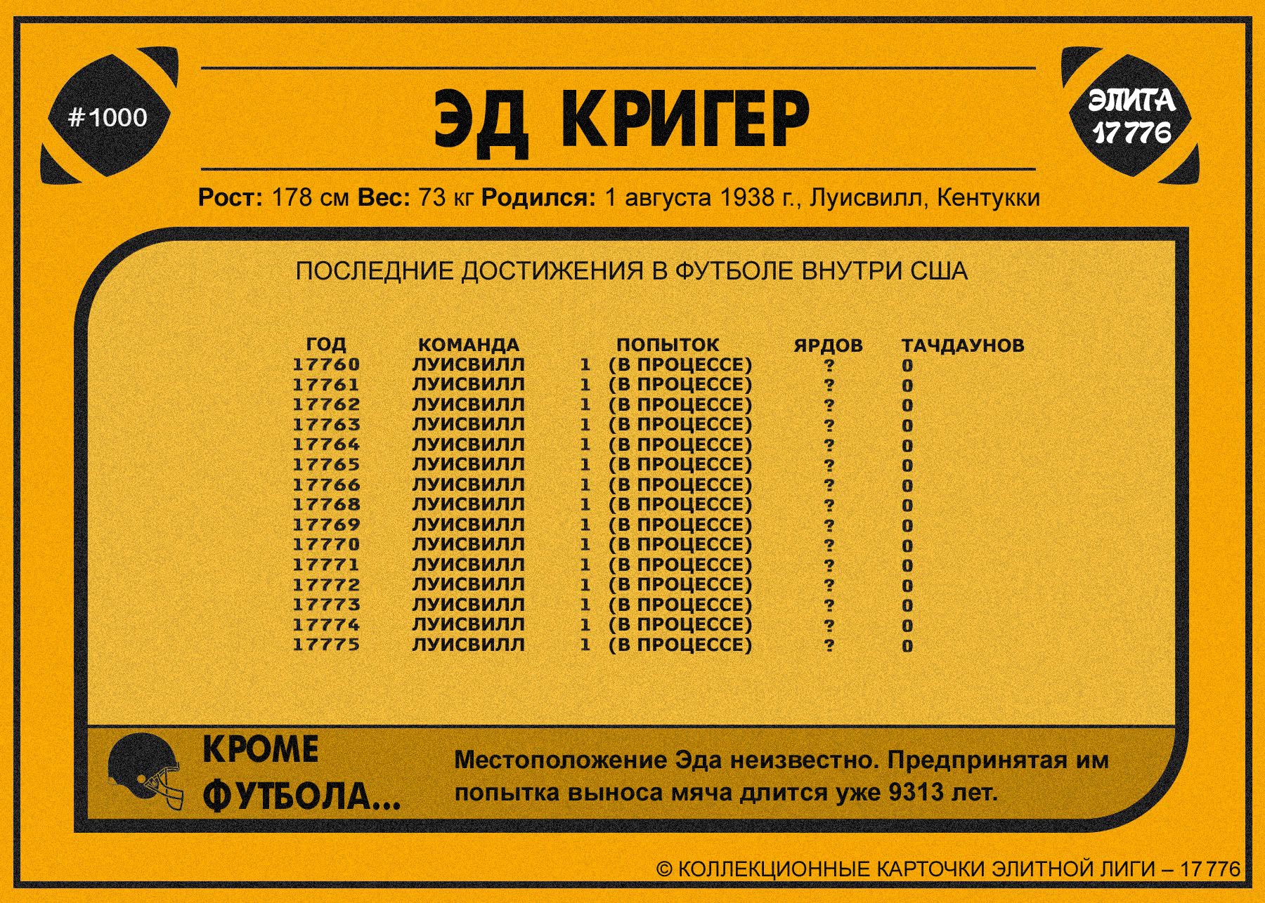 ED: Свод был размером с энциклопедическое издание, но я и остальные ребята из защиты шерстили его несколько месяцев. И наконец мы кое-что нашли. Наверное, это правило взяли из какого-то старого матча да так и оставили. В общем, там говорилось, что если завладеть мячом и оставаться в собственной зачётной зоне 10 тысяч лет без перехвата, то твоя команда автоматически побеждает и игра заканчивается. А нашей зачётной зоной, естественно, были назначены границы города Луисвилл.