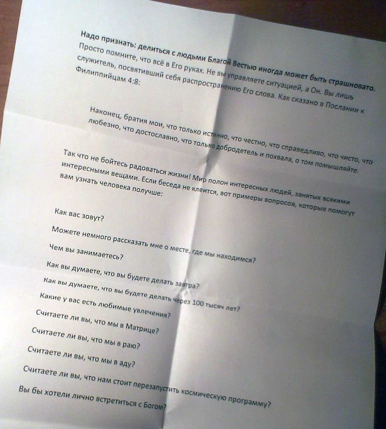 TIM: Видите ли, у меня тут… чтобы ближе познакомиться с людьми, я задаю вопросы по списку всем, с кем встречаюсь. Вот они на листочке. Можно, я задам вам хотя бы первые… десять?