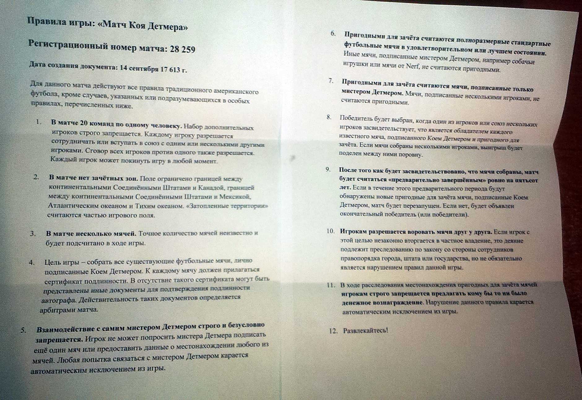 JASON: Всё равно теперь это, считай, мёртвый матч. Короче, в игре я и 19 других игроков, каждый сам за себя. Мы ездим по всей стране и пытаемся разыскать все-все мячи, подписанные Коем Детмером.